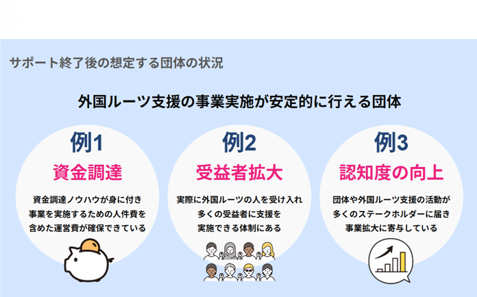本事業を通じて活動支援を受けた外国ルーツ支援団体が、団体の組織・事業運営基盤が整い、自団体の強みや、改善点、新たに取り入れたいスキル・ノウハウを生かした事業計画のもと、休眠預金活用事業等の資金を効果的に活用することを目指します。それにより、各団体が受益者の拡大を図ると共に、外国ルーツ支援の必要性や当事者のニーズ、支援によるインパクト等を効果的に発信できるようになるなどの、安定した活動体制を確立していくことを目標としています。