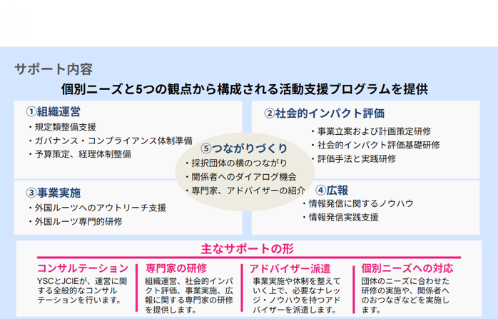 2025年度の公募に基づき、本事業に採択された8つの団体(支援対象団体)に対して、以下の5点に重点を置いて活動支援を行います。