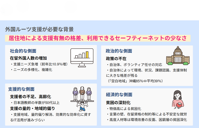 昨今、外国にルーツを持つ方々の増加に伴い、支援ニーズは多様化・複雑化しているにもかかわらず、移民・外国人受入れ政策の不在により支援が自治体やボランティア任せとなっています。