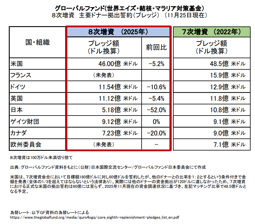 増資会合後の週明け11月25日に、外務省のウェブサイト上で、日本政府のグローバルファンドへの拠出が発表されました。この発表で、日本政府は今後3年間最大810億円の貢献を行うことが記されました。8次増資のドル換算率を適用すると、前回2022年の第7次増資で岸田首相が誓約した最大10.8億ドルから52%減の5.18億ドルとなります。さらに、他ドナーとの間で1:2マッチング制度を採用している最大ドナー米国の実際拠出額も、日本の削減の1/2に相当する額が減ることになります。